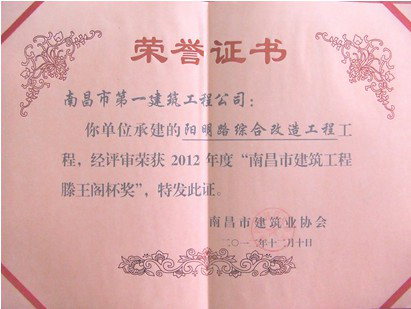 在激烈的市場競爭中,我公司本著負責任的態(tài)度,嚴把工程質(zhì)量關(guān),在“陽明路綜合改造工程”建設(shè)中榮獲2012年度南昌市建筑業(yè)協(xié)會頒發(fā)的“南昌市建筑工程滕王閣杯獎”,同時,梅文華同志獲得“優(yōu)秀項目管理工作者”光榮稱號,為公司贏得了榮譽。