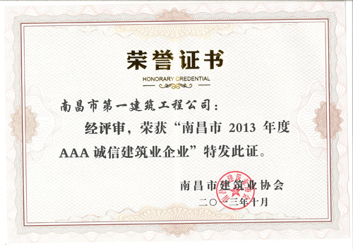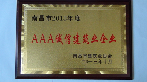 2013年10月我司獲得“南昌市2013年度AAA誠(chéng)信建筑業(yè)企業(yè)”的榮譽(yù)稱(chēng)號(hào)。